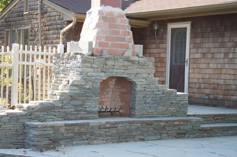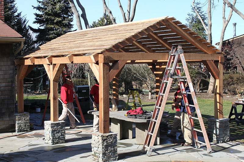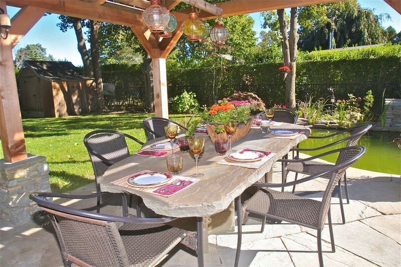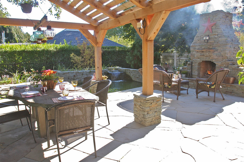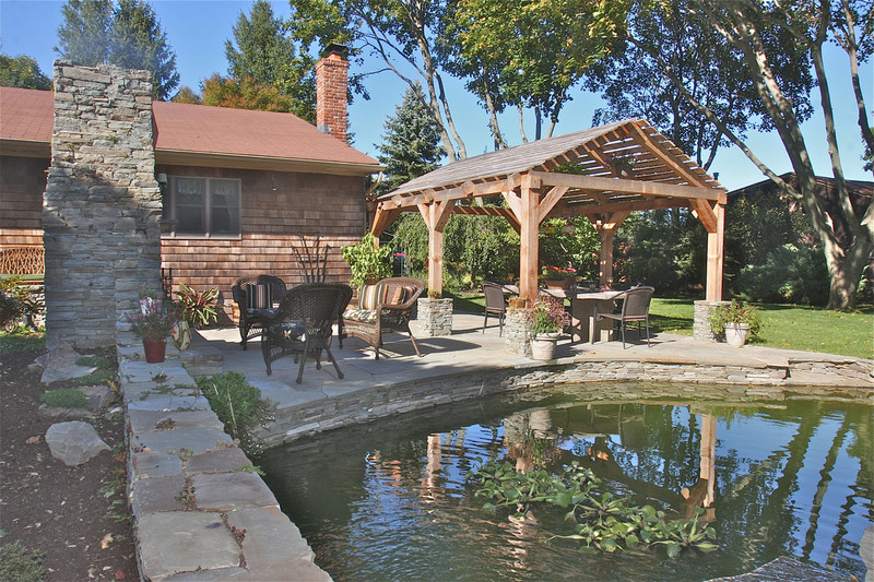 Although it was constant planning to coordinate the many components of this project, this small outdoor space has been transformed from ordinary to extraordinary! What was once an old above ground pool and wooden deck that had limited potential and entertaining space, now completes the owner’s wish list. This property boasts a Koi pond equipped with biological filtration, as well as a generously sized stone patio built for hosting gatherings. You will also find an outdoor fireplace and a specially crafted stone table that seats eight guests beneath a shaded canopy. The landscape design aims to create the atmosphere of a property that dates back 150 years. Large trees and shrubs were relocated, while moss and ground cover sheets were also added to the landscape. More than 42 tons of natural bluestone went into the construction, with the outdoor fireplace crafted using conventional building methods. The patio space is 450 square feet of 2-inch-thick stone slabs, providing an entertaining area. The Koi Pond is approximately 10,000 gallons in volume with a separate biological filtration tank that recirculates the water via a 3-foot-wide spillway. The tank is cultivated with diverse aquatic plants, which contribute both aesthetic appeal throughout the year and serve a functional role by filtering the water to preserve its clarity. The shade pergola is constructed out of rough sawn timbers of natural cedar in a post and beam fashion. The structure is set on hand cut stone piers. The covered part of this feature was built using materials salvaged from the previous deck.